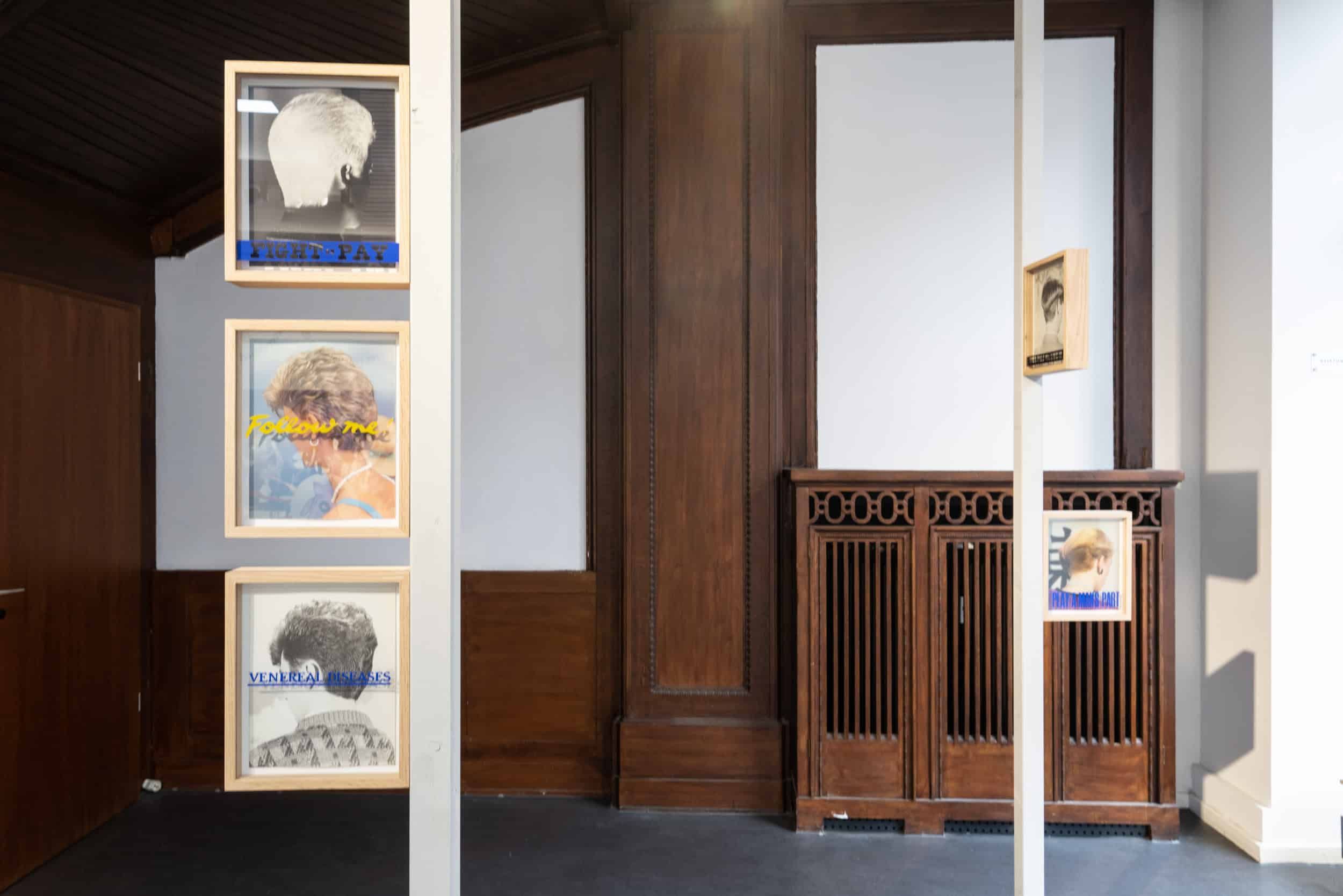 A central body of work engages photographic material drawn from 1980s U.S. hair salon catalogs. These images depict heads, read as female or male, meticulously coiffed and abstracted from bodily or contextual reference. Their origins and original function remain ambiguous: they are both functional advertising tools and silent witnesses to an aesthetic regime in which gender was communicated through hair. Presented double-sided, with both front and back of the frame exposed, the artist deliberately disrupts the photographs’ original functionality by overlaying them with typographically varied text fragments. These screen-printed excerpts derive from propaganda posters produced between 1911 and 1924, researched by the artist in the Library of Congress archives. Initially designed to recruit, mobilize, and discipline a wartime society, these texts are displaced in the artist’s intervention: estranged from their propagandistic context, they appear amplified, hyperbolic—latently sexual, aggressive, hierarchical, and insidiously normative. By imposing the semiotics of state power onto ostensibly neutral images of hair—a quotidian code deeply embedded in gendered and social norms— Rachel Libeskind exposes a binary system of social order, revealing the rigidity of normative frameworks in moments of societal tension.